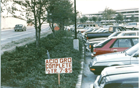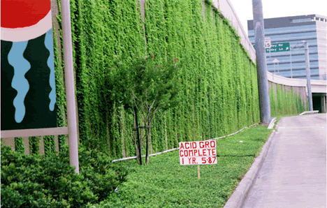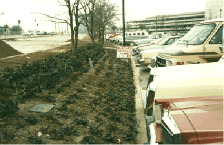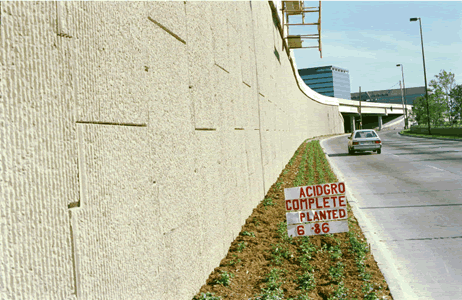 Planted in pH Balanced Ready-To-Plant soil mix (formerly called AcidGro Complete Mix). This is the Dallas Parkway wall that runs right in front of the Galleria Shopping Center. Notice that there are no plants yet installed near the curve in the road (just beyond the car) - the ground has not yet been prepared. |