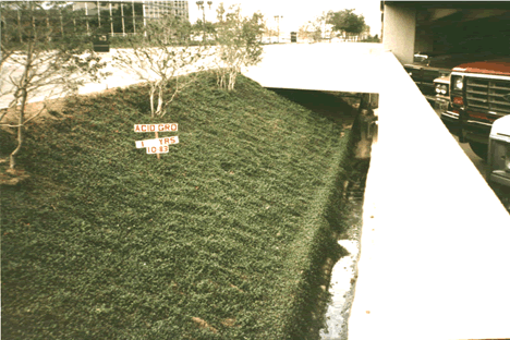 Within one year the entire area is covered with thick healthy growth. Notice that the runners at the bottom of the slope are hanging over 3 feet. This area continues to flourish years after the installation. |